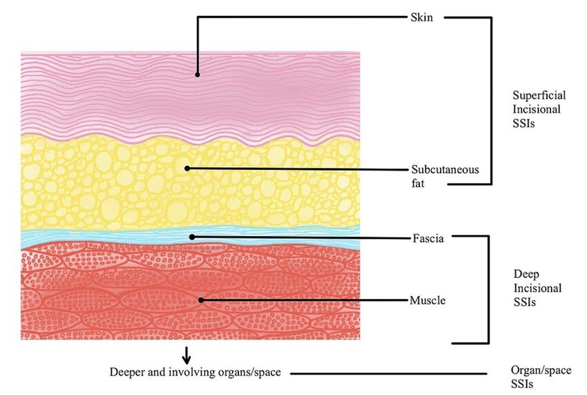 ·深切口 SSI:在切口下發(fā)展,影響肌肉和周圍組織