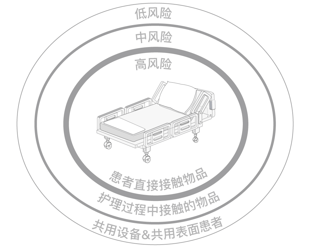 污染率、患者易受感染程度、接觸病原體的可能性這三個因素結(jié)合起來決定了低、中、高風(fēng)險——在高風(fēng)險區(qū)域需要更頻繁、更嚴(yán)格的環(huán)境清潔。風(fēng)險程度決定了所有病人護(hù)理區(qū)域的常規(guī)和應(yīng)急清潔計劃中的清潔頻率、方法和過程。