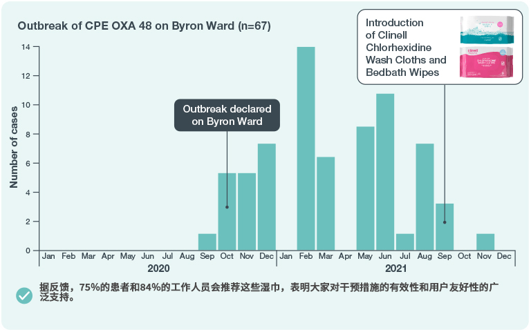 國王學(xué)院醫(yī)院感染預(yù)防與控制部總監(jiān)阿什莉·弗洛雷斯表示:“一次CPE疫情爆發(fā)期間,倫敦國王學(xué)院醫(yī)院使用了Clinell洗必泰濕巾和床單擦拭巾之后,醫(yī)院成功地控制了疫情,這可能跟其中斷了與水槽、洗手盆及相關(guān)設(shè)備使用相關(guān)的傳播鏈,同時(shí)使用Clinell氯己定洗浴巾也可能減少了患者皮膚上微生物潛在的滋生源有關(guān)。作為對(duì)英國公共衛(wèi)生署《控制CPE行動(dòng)框架》推薦措施的補(bǔ)充,這是一項(xiàng)成功地幫助我們控制CPE疫情的干預(yù)措施?!?/span>