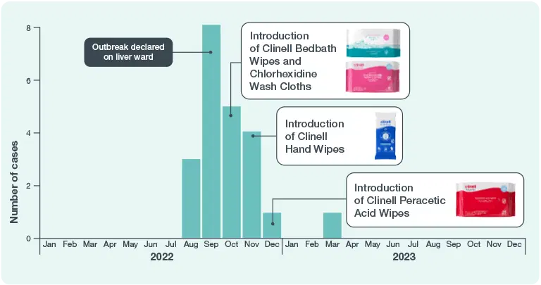 面對(duì)CPE病例激增的一所肝臟病房采用了分階段干預(yù)措施,其中包括使用Clinell產(chǎn)品(如Clinell過氧乙酸干巾和手部濕巾),并結(jié)合加強(qiáng)環(huán)境清潔及員工培訓(xùn)。這種多管齊下的策略導(dǎo)致CPE病例顯著下降,直至2024年1月未報(bào)告任何新病例。反饋意見幾乎一致正面,突顯了患者與員工合作在感染控制中的關(guān)鍵作用。