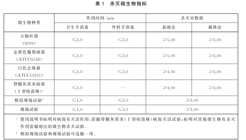根據(jù)手消毒劑通用要求(GB 27950-2020),依據(jù)手消毒劑產(chǎn)品特性殺滅微生物指標(biāo)的效果應(yīng)符合下表的要求。