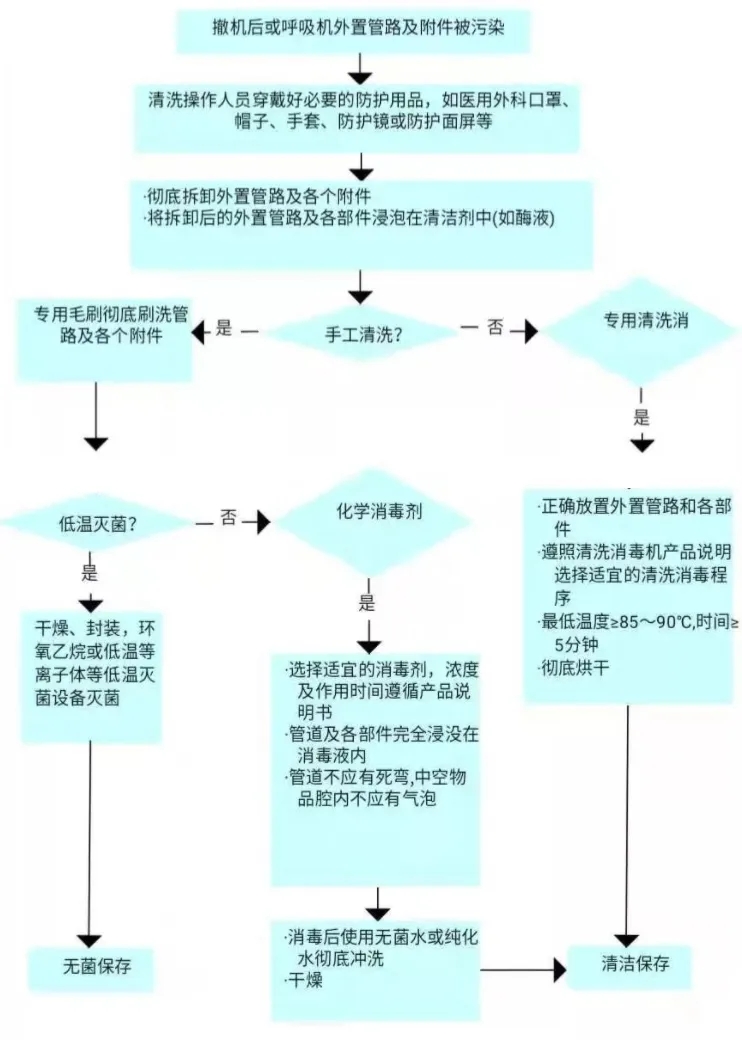 對于外置管路及附件,可復用管路及附件一人一用一消毒或滅菌,遇污染時及時更換并清潔消毒,消毒流程可參考下圖。一次性管路及附件使用后按照感染性醫(yī)療廢物處置,不推薦定期更換螺紋管。