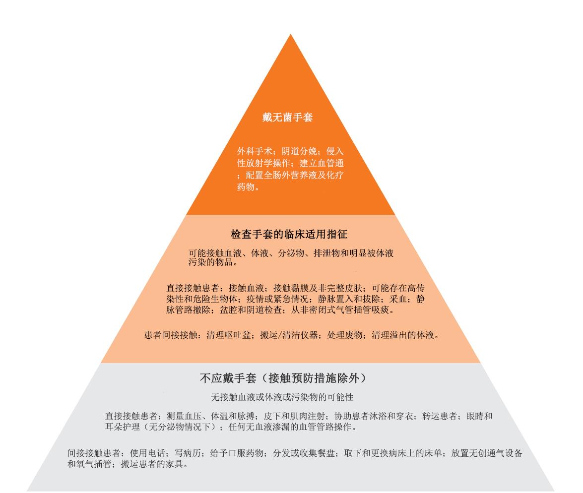 手套的使用必須遵循標準預防措施和接觸預防措施。來源于世界衛(wèi)生組織的金字塔圖列舉了部分臨床實例:其中一些場景無需戴手套,另一些場景需使用檢查手套或無菌手套。無論是否需戴手套,在適當時機均應執(zhí)行手衛(wèi)生。