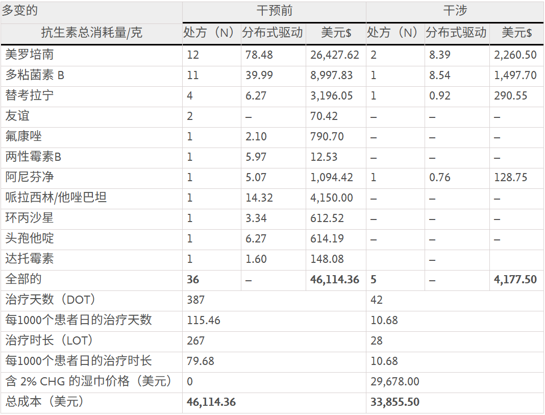 干預(yù)前用于 CLABSI 的抗菌藥物費(fèi)用:約46,114.36美元。干預(yù)期則降至 4,177.50美元。